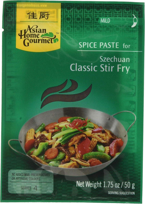 Asian Home Gourmet Spice Paste for Szechuan Classic Stir Fry in 50 gram sachet. A touch of chilli and sesame oil, together with the robust flavours of broad bean paste, creates a stir-fry that has become a classic in Szechuan restaurants around the world.