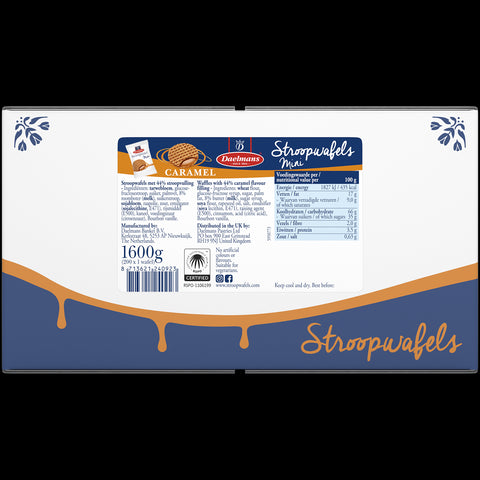 DaelmansA classic Dutch treat in a bite-sized portion. These mini stroopwafels are filled with a smooth caramel syrup made with natural Bourbon vanilla. Perfect with coffee or tea, each one is individually wrapped for freshness and convenience. Great for parties, offices or on-the-go snacking. This box of 200 is ideal for sharing or stocking up.
