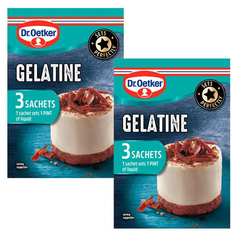 Dr OetkerDr. Oetker Gelatine Sachets - 1 pint of liquid per sachet. Gelatine is a versatile setting agent used in both sweet and savoury cooking - from souffles to mousses and homemade ice cream and gummy sweets. Our powdered gelatine is beef gelatine, and we also offer Dr. Oetker Vege-gel, a vegetarian alternative.