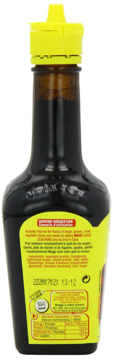 MAGGIMaggi Liquid Seasoning is a strong aromatic liquid flavouring. Simply add Maggi Liquid Seasoning drop by drop to bring out the delicious flavours in your stir-fries, casseroles, soups and sauces! Suitable for vegetarians, it's great to add a delicious roasted flavour to vegetarian dishes.With our World Foods range, we're proud to celebrate the fact that people all over the world love Maggi®. From Nigeria to India, whether you're looking for a taste of home or a chance to explore something new, you can find what you're looking for with Maggi® World Foods.