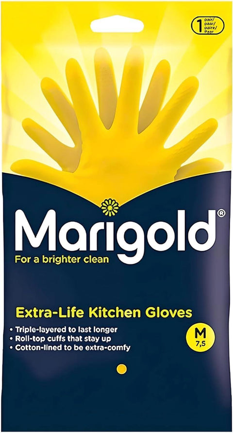 MarigoldDipped three times for extra protection and durability, Extra Life Kitchen Gloves have special roll top cuffs that stay up and an extra comfy cotton lining. safe hold pattern gives you more grip, and our special coating stands up to the harshest kitchen and oven cleaners.